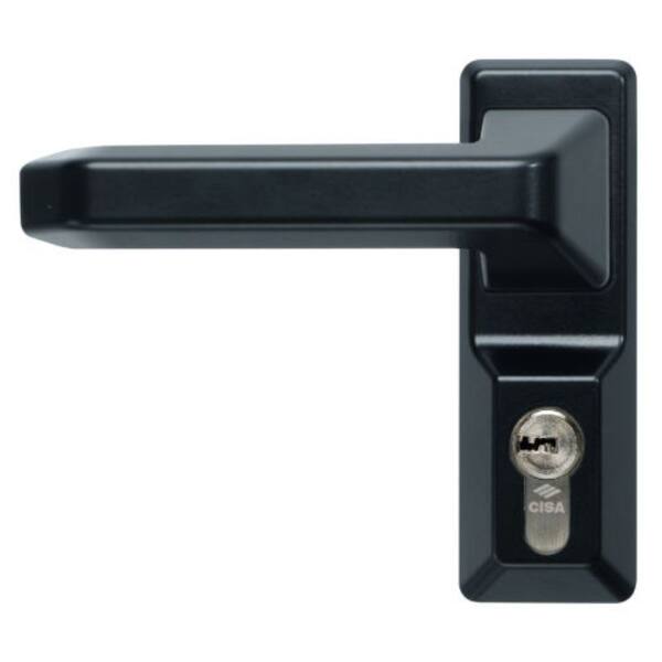 Maner exterior negru (Cod CISA 07A78.38.0): Face parte din gama premium de manere antipanica, dotat cu cilindru și cheie pentru acces securizat.
